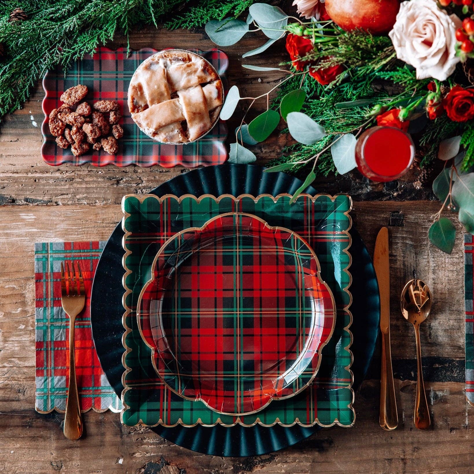 This classic plaid design brings festive charm, while the scalloped edges add a touch of elegance. Includes 8 paper plates, 9x9 inches.