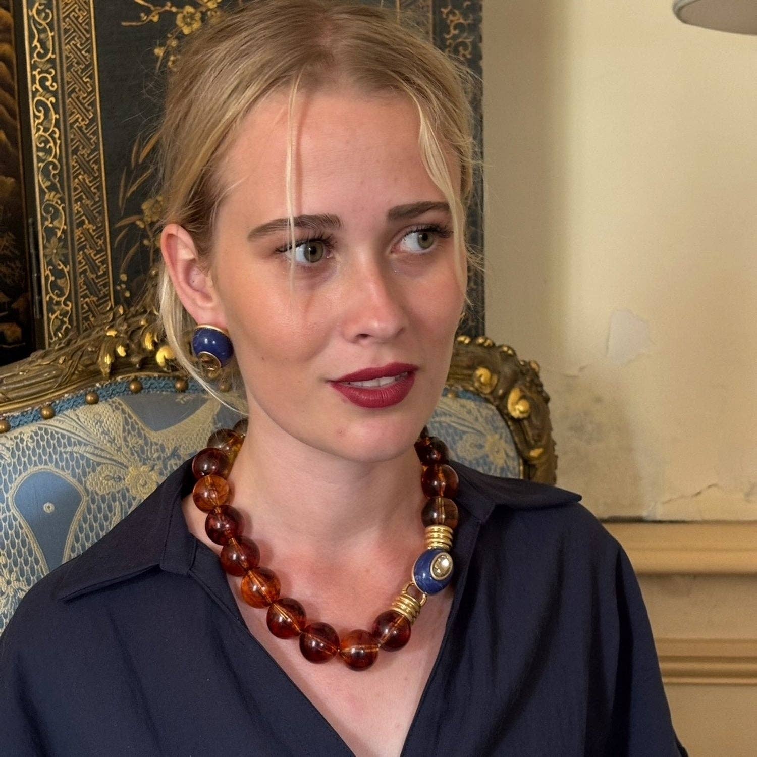 The Caroline Necklace is a striking tortoise resin statement necklace that blends modern simplicity with timeless glamour. Designed in tortoise-hued resin, it features a lapis oval clasp set with a faceted smoke topaz stone, adding a soft touch of contrast and sophistication. The versatile clasp can be worn at the back for a sleek finish or to the side for a more decorative, evening look. Lightweight and comfortable, this malachite resin necklace is perfect for anyone who loves bold, easy-to-wear jewelry that makes an impression from day to night.