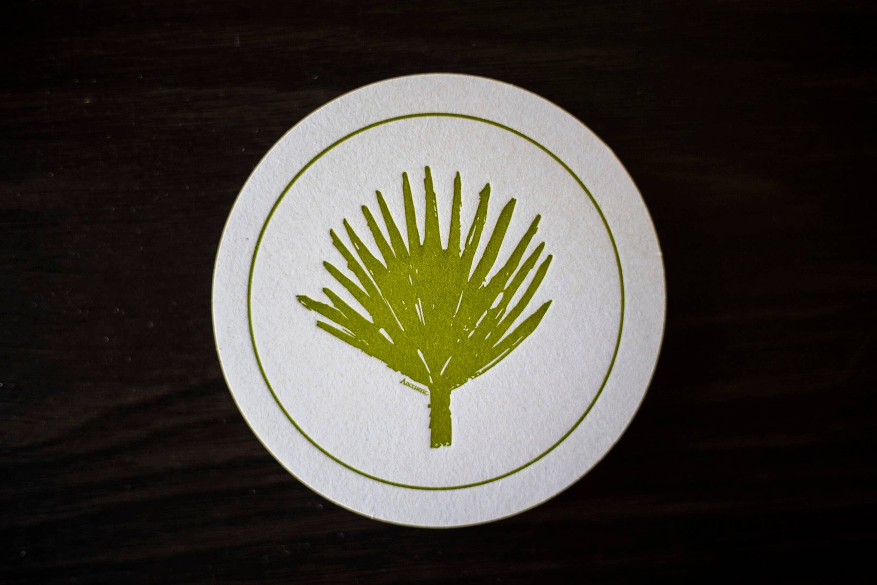 Take a walk through coastal palm forests with bright, chartreuse Palm Frond Coasters. Choose from a set of 9 or a box of 50 coasters, individually printed with a vintage letterpress. Roomy 4″ round eco-board stock is both durable and holds moisture. Allow to air dry for multiple uses. Pair with our Palm Frond Note Cards and Placemats for a charming set! Coasters come in sets of 9 or 50, sized at 4". Round heavyweight board stock is 2mm thick, durable, and holds moisture. Allow to air dry for multiple uses. Handcrafted in the USA.