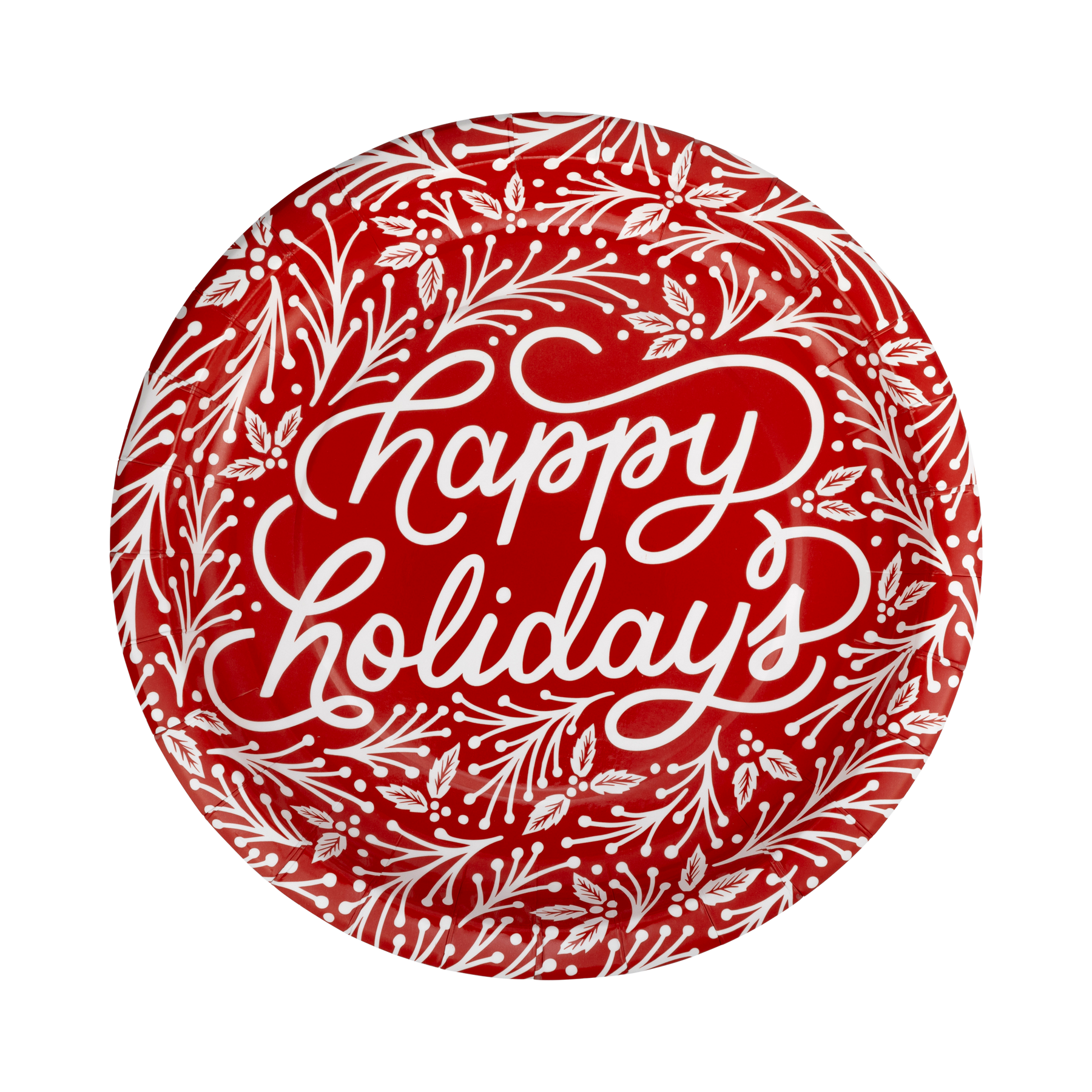 Serve up some holiday cheer with our Happy Holidays 10" Plate! This bright red plate will add a festive touch to any meal, making every bite even more enjoyable. Perfect for sharing meals and memories with loved ones this holiday season. • includes 8 paper plates • 10" x 10"