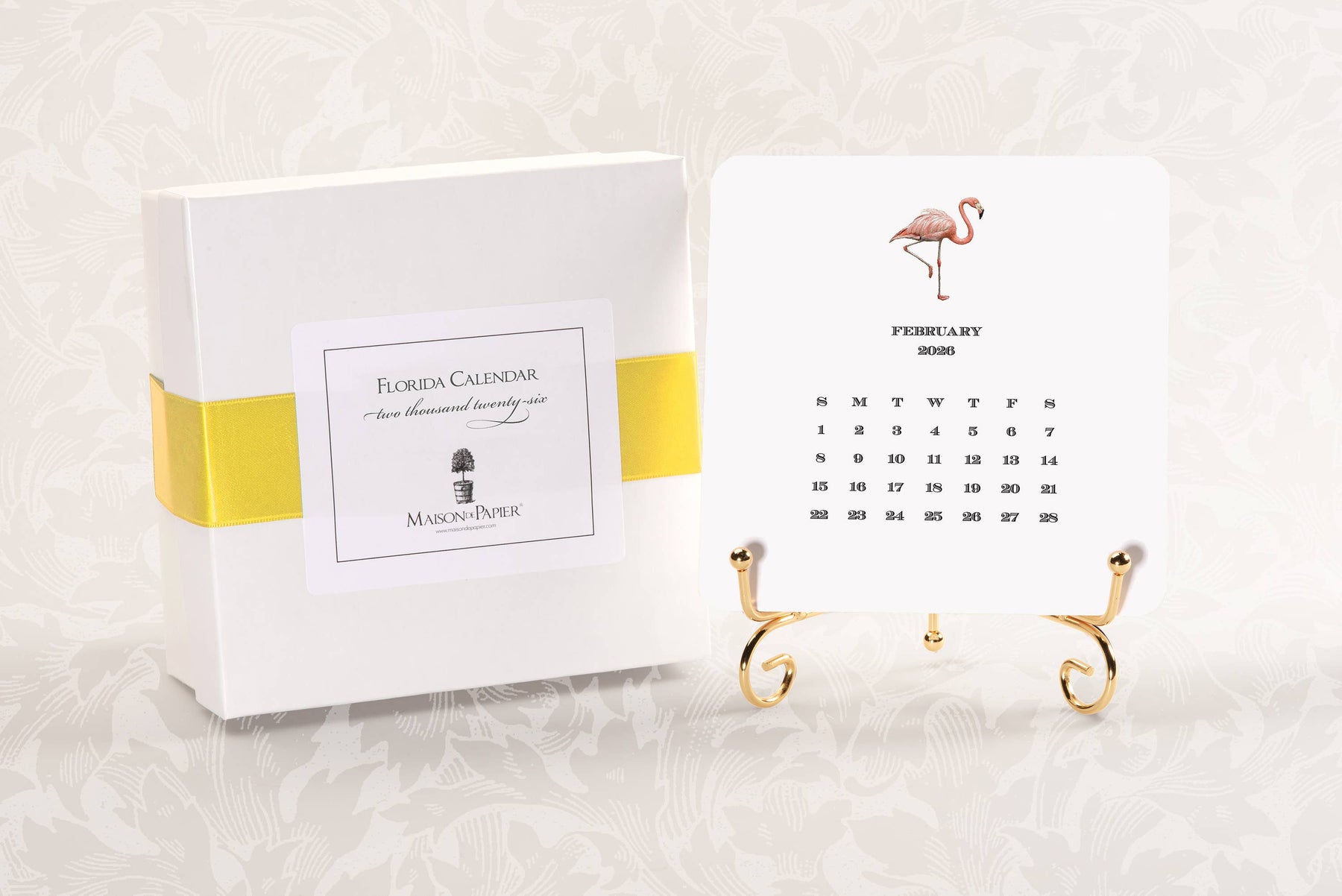Complete Set with Easel: Our Florida Calendar features 12 meticulously crafted 5 ½ inch square cards, printed on premium 100lb card stock. Each month unveils a unique illustration, showcasing the iconic symbols and treasured landmarks of Florida. The set includes a metal easel, thoughtfully designed to elegantly display each month’s card. The sturdy easel ensures that the artwork takes center stage, adding a touch of sophistication and Floridian pride to any space. Packaged in a beautifully crafted box and sealed with a double-faced satin ribbon, this calendar is a true luxury gift that exudes both elegance and authenticity. Each card, printed on premium 100lb card stock, features unique illustrations that capture the spirit of this beloved state.