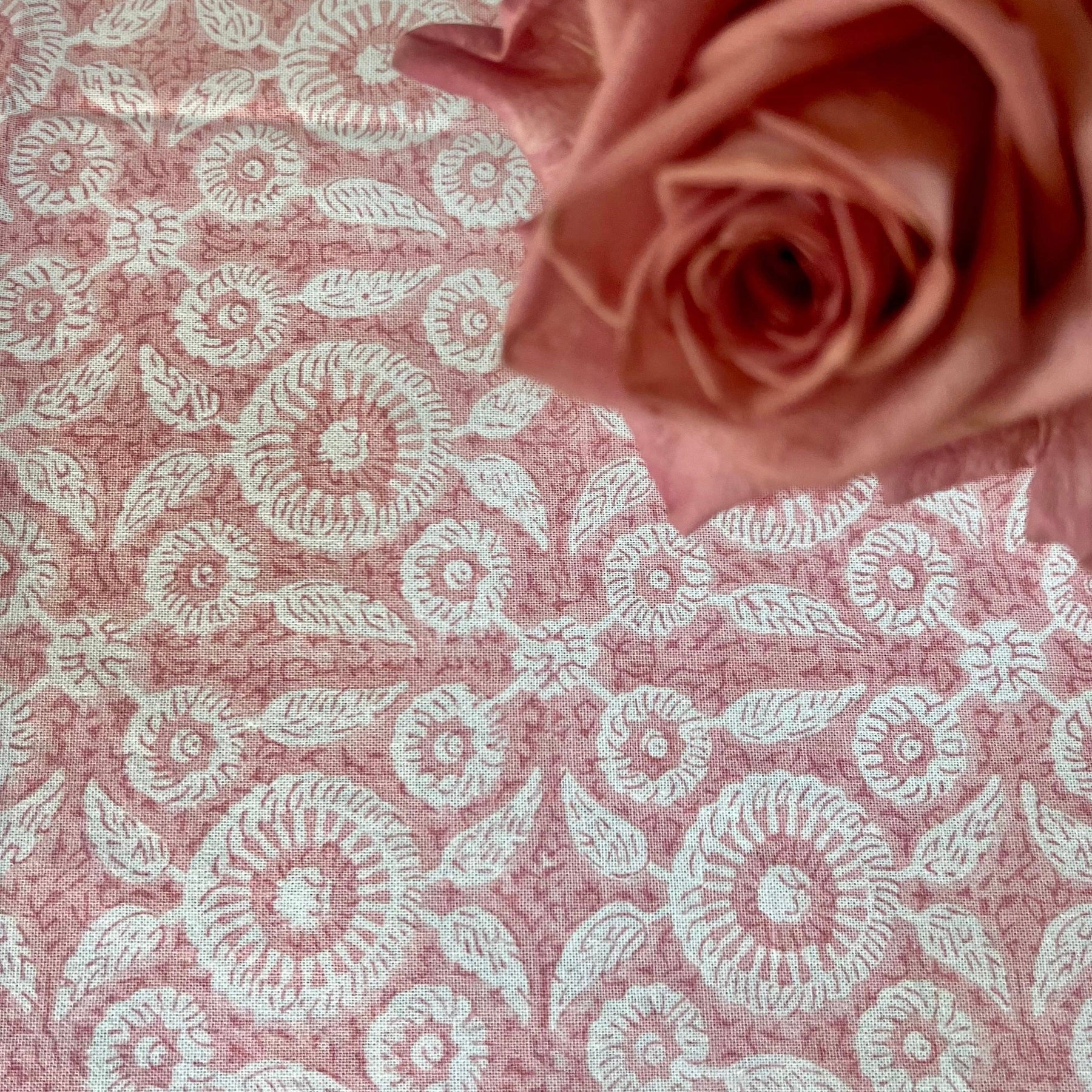 This tablecloth is 100% cotton, measuring 120" x 70" and pairs with coordinating napkins that are also available for purchase. Care instructions: Hand or machine wash separately in cold water on gentle cycle.